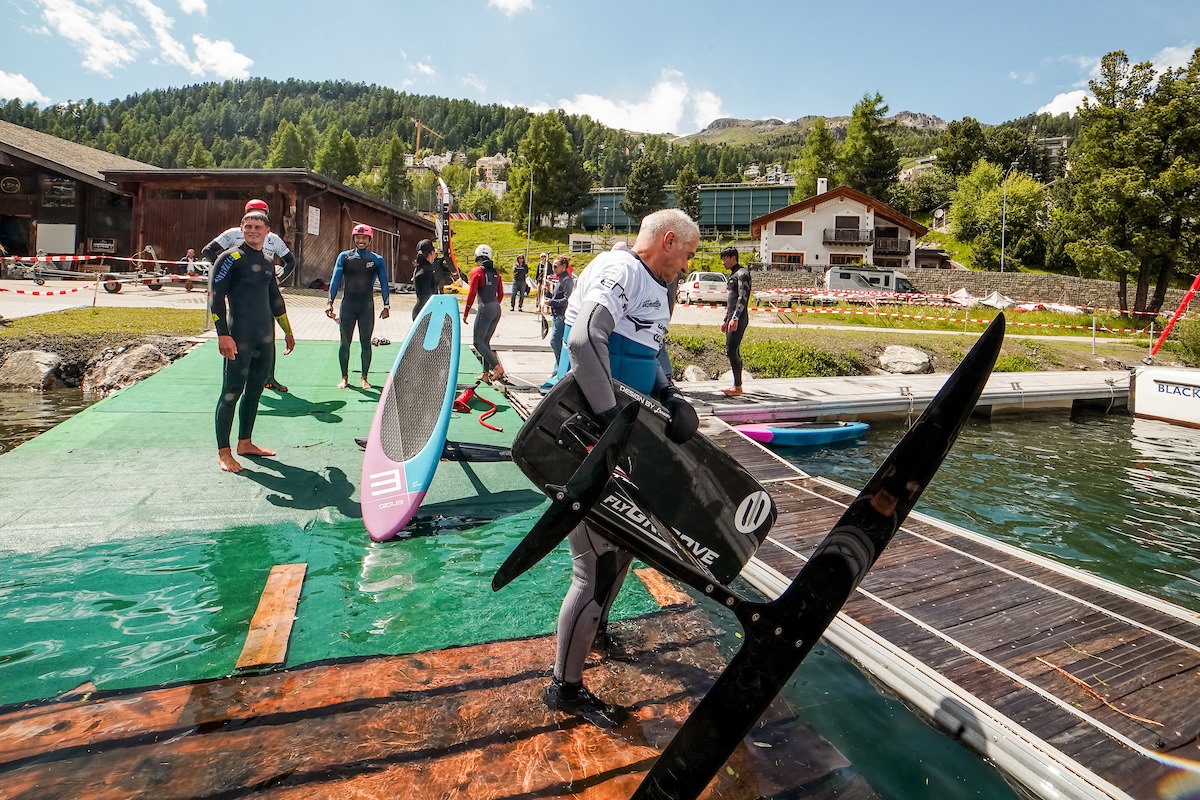 Unfortunately, there was no racing today due to inconsistent light winds on Lake Silvaplana. Instead, the riders made the most of the free afterpumfoiling, SUP foiling, tow foiling, and even showcasing an impressive display of lightwind wingfoiling many years and is a paradise for a multitude of windsports and foiling activities.